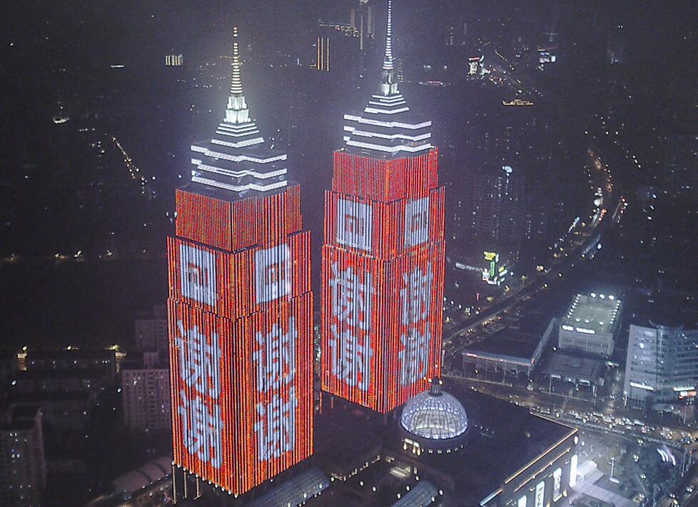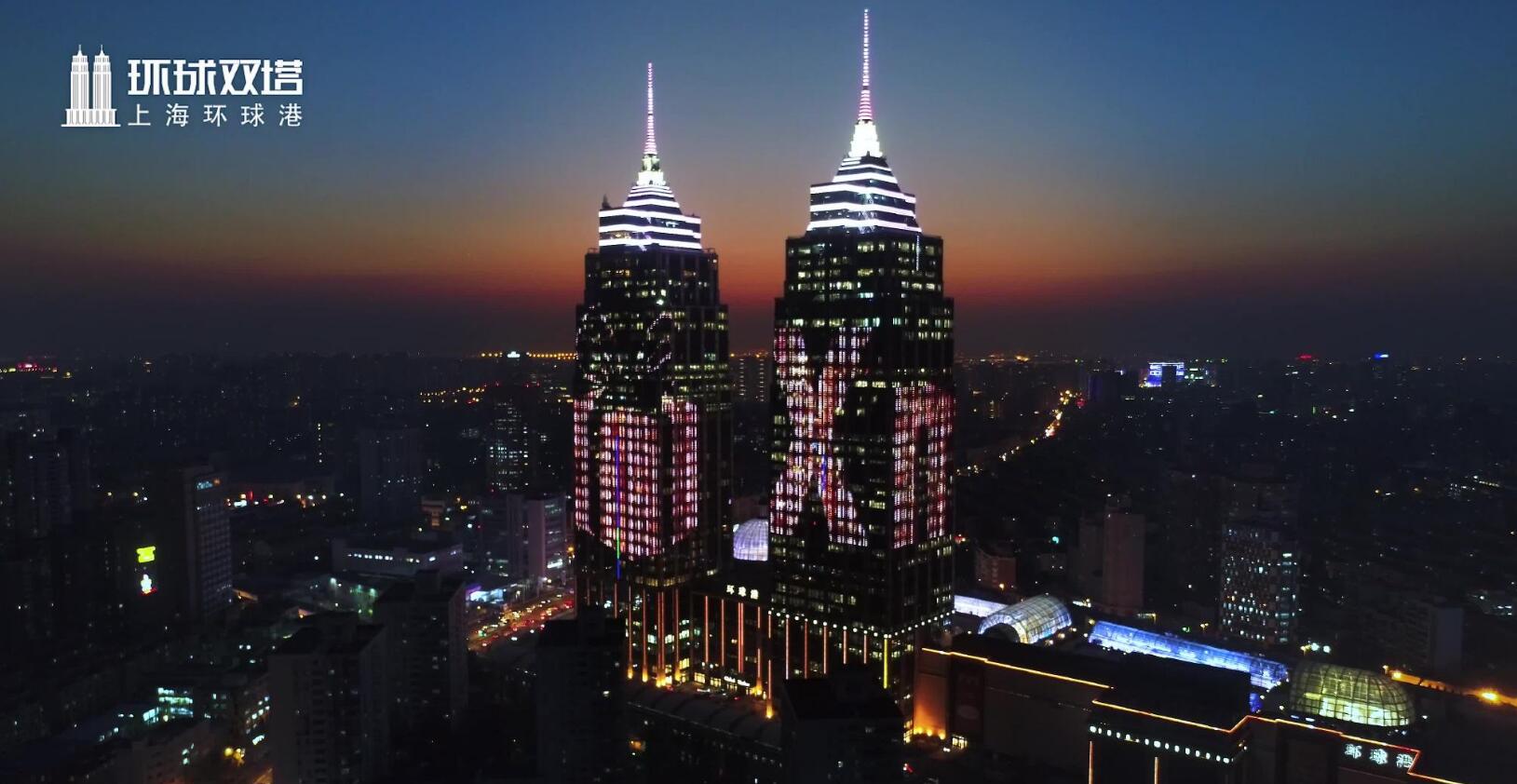 上海雙子塔廣告,上海環(huán)球雙塔燈光秀廣告,萬事成傳媒上海雙塔地標(biāo)廣告