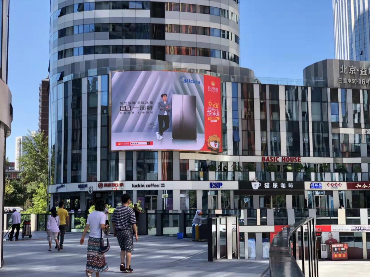 樓頂展示面為東、西向,畫面同步播放。樓體幅寬80米,高150米,為三里屯地區(qū)第一高樓。最大程度影響工體北路、二環(huán)、三環(huán)、三里屯商圈人群。