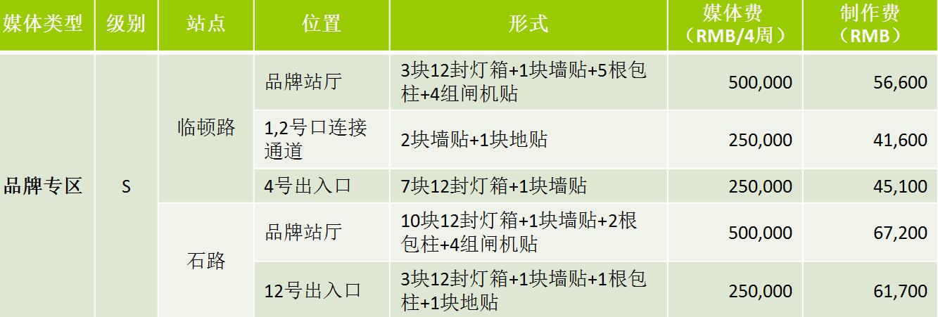 S級(jí):1、2號(hào)線換乘站——廣濟(jì)南路 1、2號(hào)線換乘區(qū):8根包柱+換乘區(qū)4塊12封燈箱+1塊墻貼 媒體費(fèi)(RMB/4周)720,000;制作費(fèi):90,500 1、2號(hào)線換乘通道:6塊梯側(cè)貼+1塊梯頂 媒體費(fèi)(RMB/4周)580,000;制作費(fèi):53,300 品牌站廳:3塊12封燈箱+8根包柱+5組閘機(jī)貼 媒體費(fèi)(RMB/4周):380,000制作費(fèi):62,700 1、2號(hào)線換乘站臺(tái):12根包柱+3塊墻貼+20面吊旗 媒體費(fèi)(RMB/4周):500,000制作費(fèi):86,300 |