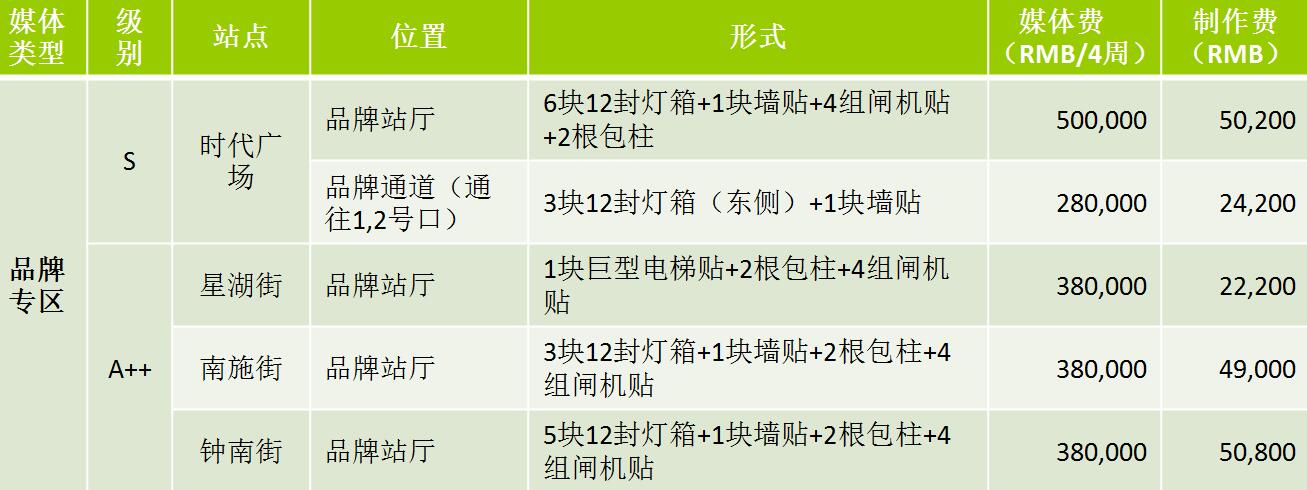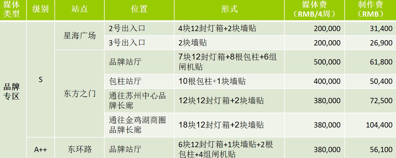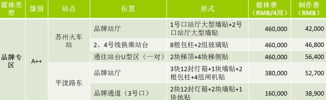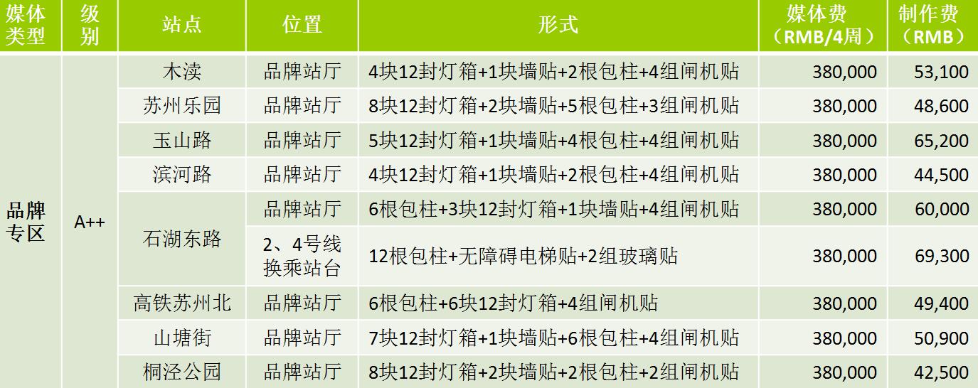 蘇州地鐵12封燈箱 級(jí)別 S:媒體費(fèi)(RMB/4周/站) 72,000元 A++:媒體費(fèi)(RMB/4周/站)58000元 A+:媒體費(fèi)(RMB/4周/站)35000元 A:媒體費(fèi)(RMB/4周/站)28000元 制作費(fèi):950元 ? |
