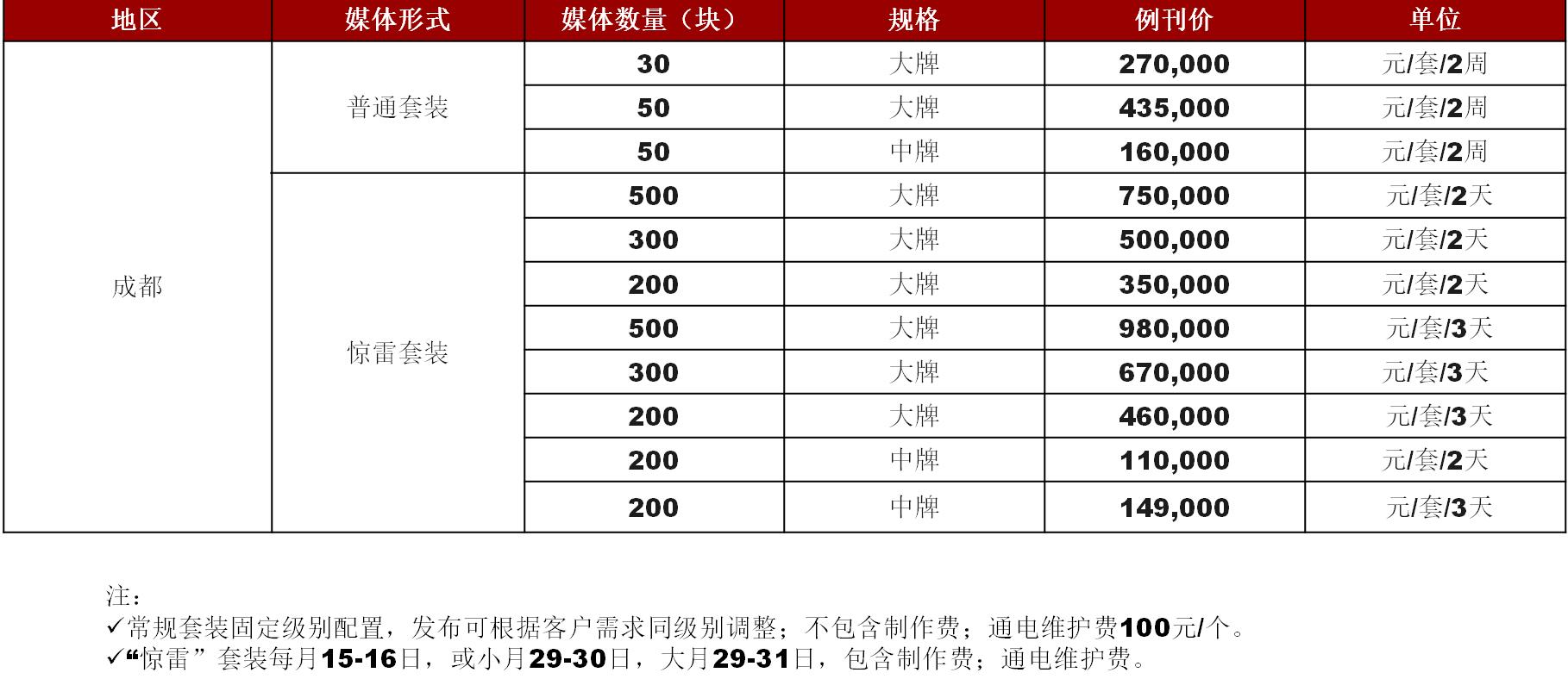 成都主城區(qū) 2018年度新一線城市 覆蓋成都中心城區(qū)80%以上點位 1200塊燈箱 人民南路、蜀都大道、順城大道、長順街、二環(huán)路、 益州大道、青羊大道、東大街、蓉都大道……春熙路、天府廣場、鹽市口、總府路…… 成都-金堂縣 成都東進戰(zhàn)略主戰(zhàn)場 230塊燈箱 迎賓大道、十里大道、成金大道、濱江路、萬達商圈、大學城…… ? |