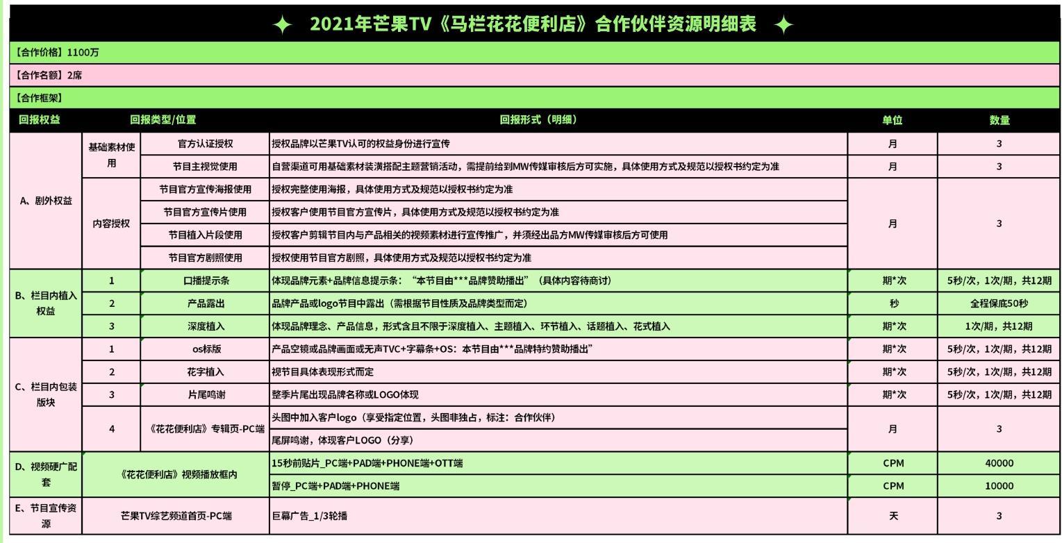 2021年芒果TV《馬欄花花便利店》單期合作資源明細(xì)表