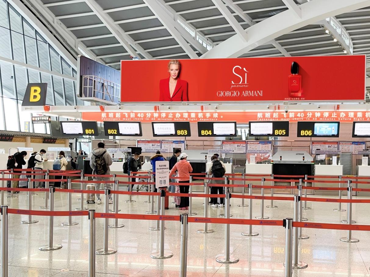 T2航站樓三層國(guó)內(nèi)出發(fā)廳大門(mén)入口處廣告