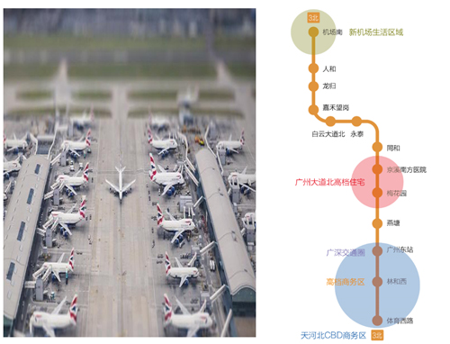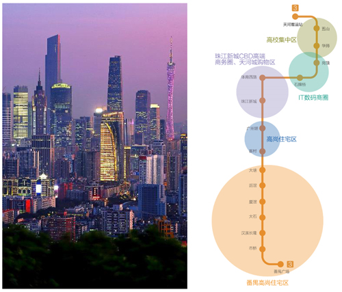3號(hào)線 ——高端CBD線:3號(hào)線與1號(hào)線、3北線、5號(hào)線、8號(hào)線及APM線同時(shí)接軌,連接了廣州最高端的商務(wù)區(qū)(珠江新城)、最繁華的商業(yè)區(qū)(天河城)、最高檔的住宅區(qū)、最高密度的IT數(shù)碼商圈(崗頂)、以及廣州多個(gè)重點(diǎn)院校(華工、華師和華農(nóng)),匯集了高密度的高端素質(zhì)客流。