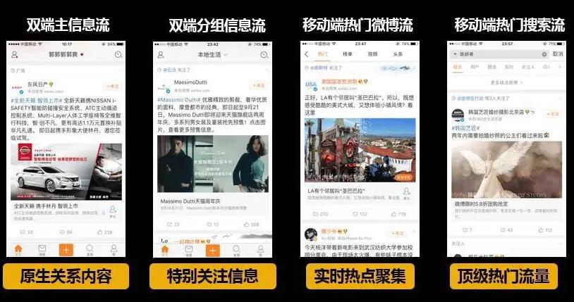 3.流量大,到達(dá)率高。微博等內(nèi)容信息用戶數(shù)量大,目的是獲取信息。用戶使用這些應(yīng)用程序的頻率相對(duì)較高。在各種信息流中插入類似形式和風(fēng)格的廣告更容易被用戶刷。