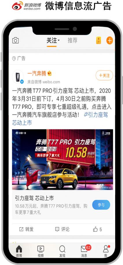 當我們刷微博的關(guān)注好友動態(tài)時,總是會不經(jīng)意點擊進入一個信息流廣告中,不管是圖片、文字還是視頻,其呈現(xiàn)和普通用戶發(fā)出的微博動態(tài)毫無二致,但其推送的內(nèi)容經(jīng)常都是非常符合用戶需求的,如果仔細觀察,可以看到其推廣賬號并不在關(guān)注欄中,而單純是由微博推薦到動態(tài)當中的。用戶們會在不經(jīng)意間被這樣的廣告所迷惑,會因為其突然出現(xiàn)在資訊動態(tài)中而難以忽視,同時,用戶也可能刷到感興趣的廣告信息而產(chǎn)生關(guān)注。