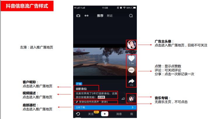 出現(xiàn)在抖音APP推薦頻道上滑第四位,廣告時(shí)長(zhǎng)為5s-30s,每個(gè)用戶每天最多看1條廣告;每條廣告對(duì)每個(gè)用戶只展示1次,同一素材最多只能投放1天,不支持各種形式的同一素材重復(fù)投放。