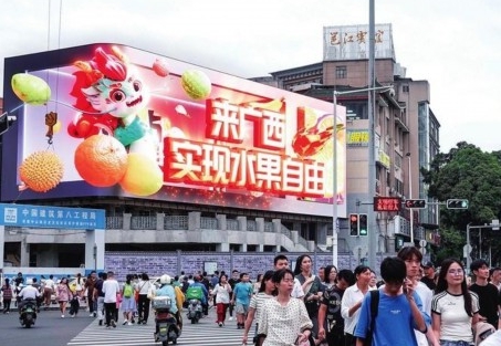 “來廣西實(shí)現(xiàn)水果自由”的宣傳片出現(xiàn)在中山路裸眼3D廣告大屏上,鮮活生動。