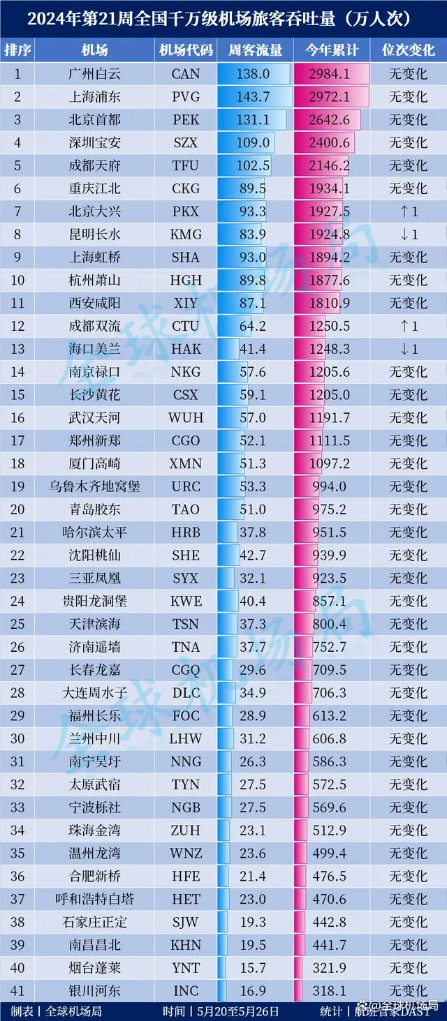 2024年第21周全國(guó)千萬(wàn)級(jí)機(jī)場(chǎng)旅客吞吐量出爐?。ǖ?1周:5月20日至5月26日)上海浦東機(jī)場(chǎng)以143.7萬(wàn)人次的周客流量連續(xù)8周拿下首位,與上周相比,客流量減少了2.4萬(wàn)人次。從累計(jì)客流方面來(lái)看,上海浦東機(jī)場(chǎng)將其與廣州白云機(jī)場(chǎng)的差距進(jìn)一步拉近至12萬(wàn)人次。北京大興機(jī)場(chǎng)則是在第21周實(shí)現(xiàn)了對(duì)昆明長(zhǎng)水機(jī)場(chǎng)的反超,將累計(jì)客流的排名提升至第7位。成都雙流反超了??诿捞m,全國(guó)排名提升至第12位。